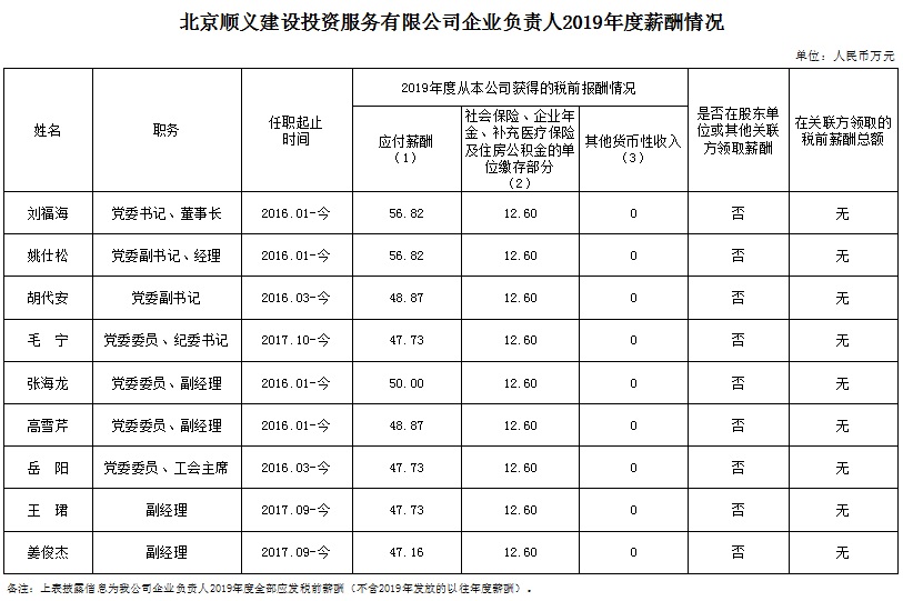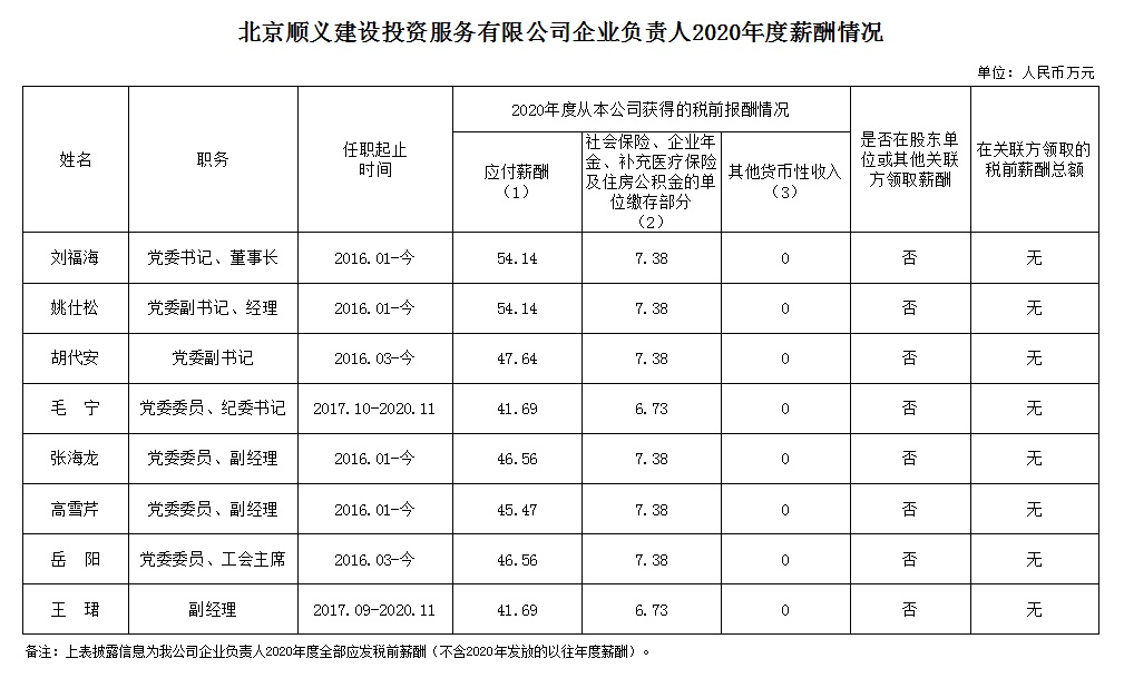 北京順義建設投資服務有限公司企業負責人2020年度薪酬信息披露