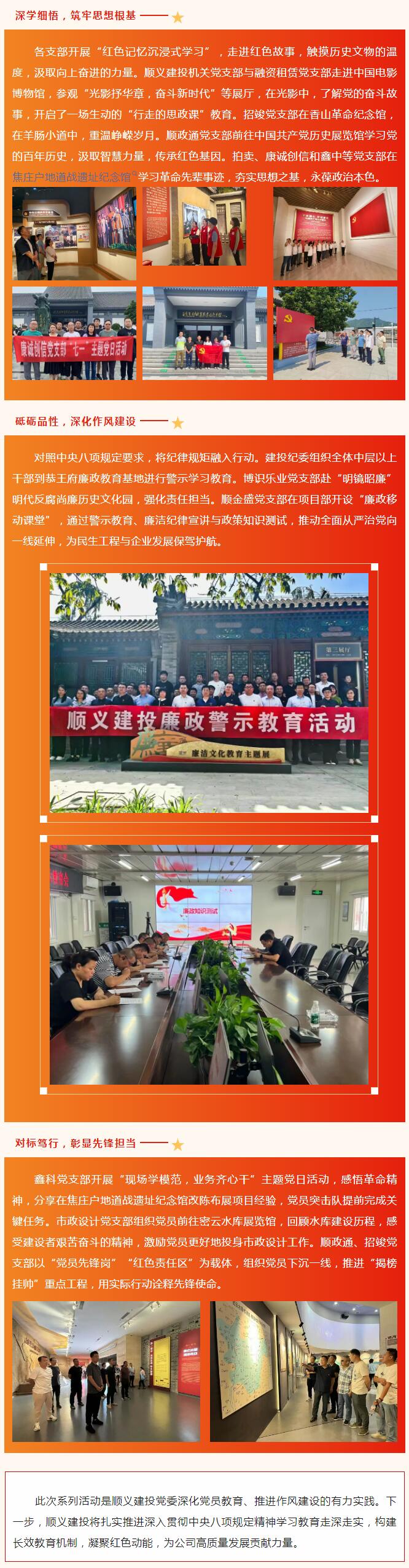 在慶祝中國共產黨成立104周年之際,順義建投黨委結合中央八項規定精神學習教育,組織所屬黨支部開展系列主題黨日活動,在學思踐悟中筑牢信仰之基,在躬身力行中彰顯先鋒本色,交出一份有深度、有溫度的黨員教育實踐答卷。