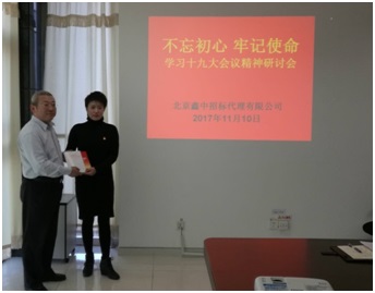 副經理王珺向北京鑫中招標代理有限公司黨支部贈送學習資料。