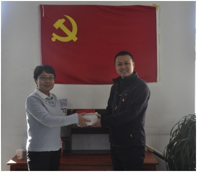 黨委委員、紀委書記毛寧向北京天儀建設工程質量檢測所黨支部贈送學習資料。