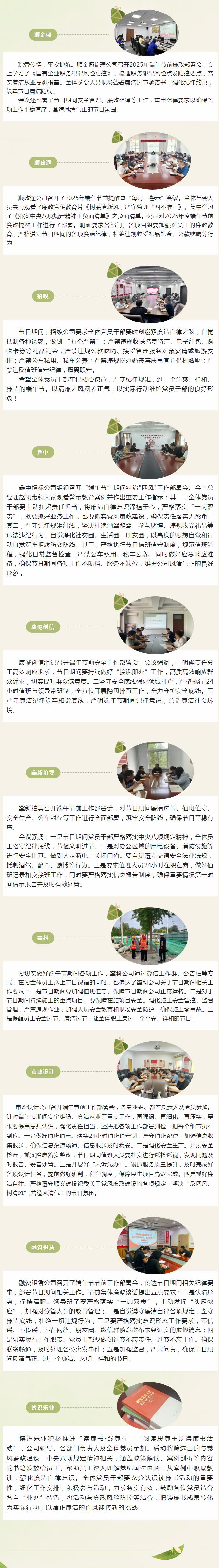 端午佳節至,清風正氣存。值此傳統節日來臨之際,為深入貫徹落實中央八項規定精神,持之以恒糾 “四風”,嚴防 “節日病”,順義建投各子企業黨支部開展“端午節”廉政提醒暨“每月一警示”會議,為全體黨員干部敲響廉潔警鐘,確保節日期間風清氣正。