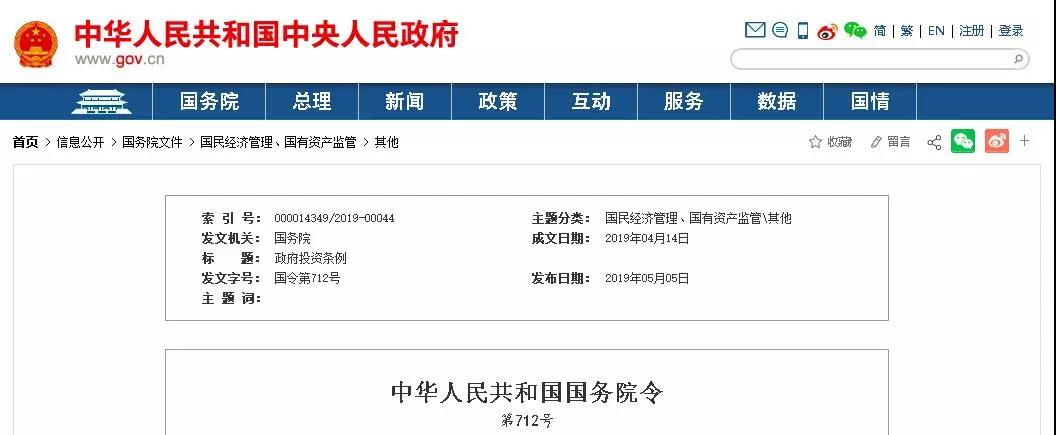 國務院總理李克強簽署國務院令,公布《政府投資條例》,自2019年7月1日起施行。