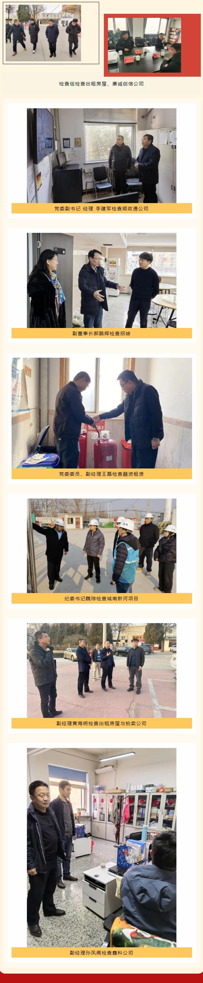 為切實做好春節期間服務保障工作,確保節前重點工作部署會各項工作要求落實到位,按照《重要時期安全服務保障方案》安排,順義建投領導班子成員帶隊對下屬子企業開展督導檢查,確保春節期間企業安全穩定。1月23日——1月26日,公司領導班子采取分片包干形式,對下屬企業的辦公區域、監理項目、出租房屋等進行詳細檢查,對發現的問題,要求認真整改,確保落實到位。