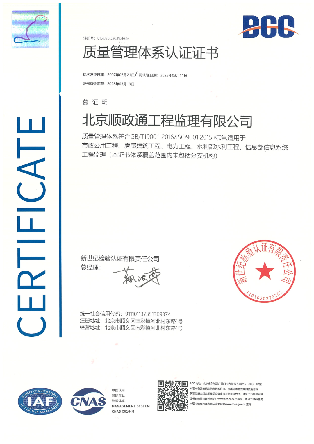 北京順政通工程監理有限公司順利通過管理體系再認證