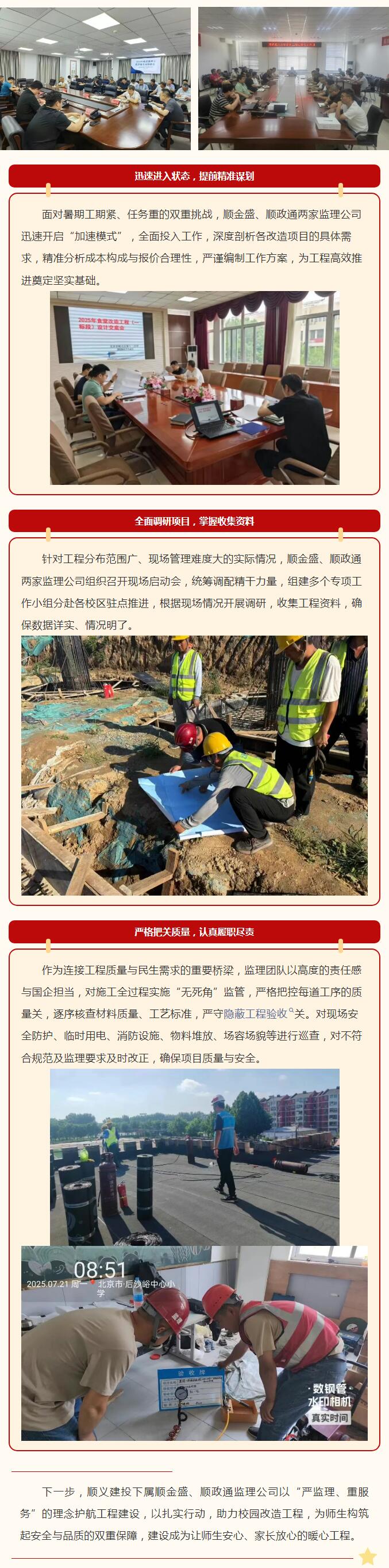 順義建投下屬子企業順金盛監理公司、順政通監理公司承接區內部分學校食堂、校內設施、專業教室改造,以及供暖系統升級和配套接收學校改造等多項監理項目。面對時間緊、任務重和標準高等要求,兩家監理公司高度重視,周密部署,多措并舉,確保項目按時保質完成