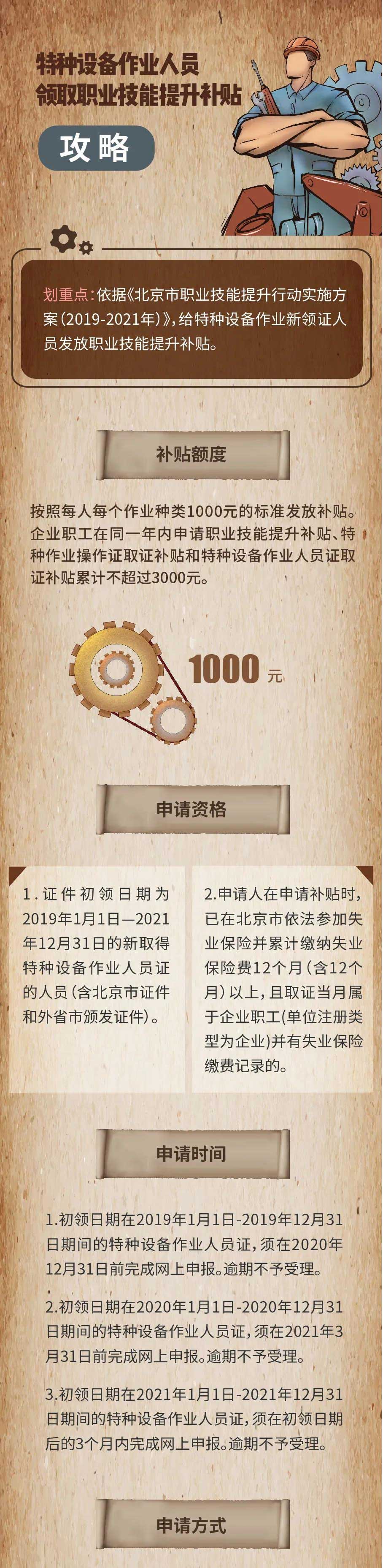 為貫徹落實黨中央、國務院關于實施職業技能提升行動決策部署,把職業技能培訓作為保持就業穩定、緩解結構性就業矛盾的關鍵舉措,作為經濟轉型升級和高質量發展的重要支撐,按照北京市人民政府辦公廳關于印發《北京市職業技能提升行動實施方案(2019-2021年)》的通知要求,北京市市場監督管理局、北京市人力資源和社會保障局和北京市財政局共同推出職業技能培訓支持方案,按照每人1000元的標準,對2019年1月1日至2021年12月31日初次取得特種設備作業人員證件的個人進行補貼。